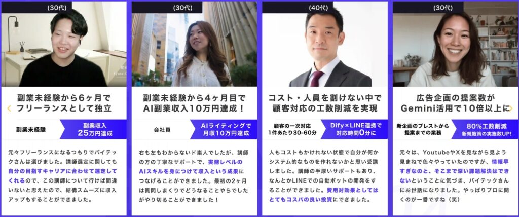 ここまでの特徴を踏まえると、バイテック生成AIは「AIスキルを実務や副業に活かしたい人」に適した設計になっていることがわかります。特に、基礎から学びながらアウトプットまで一貫して取り組めるため、独学でつまずいた経験がある場合でも進めやすい環境といえるでしょう。