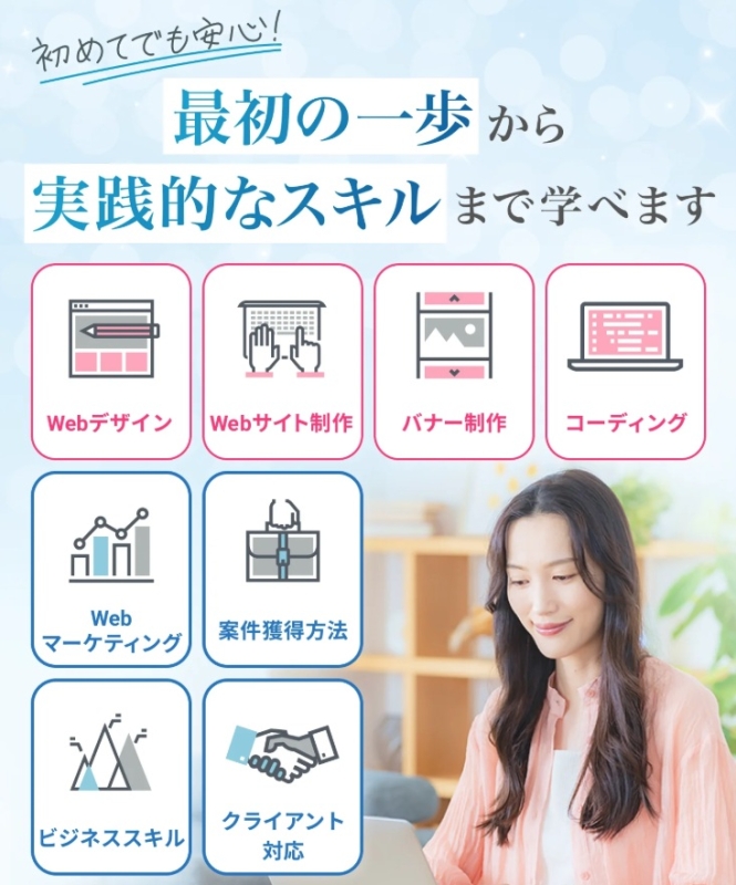 これまでプログラミングやWebデザインの経験がない方でも、段階的にスキルを身につけていける環境が整っています。