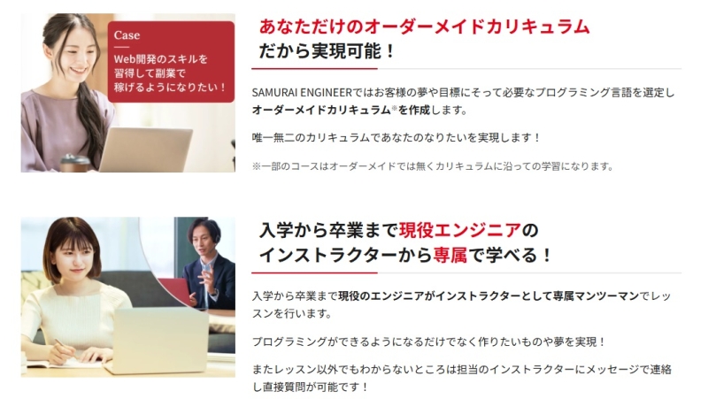 侍エンジニアでは、受講者ごとにカリキュラムを設計するため、「転職したい人」と「副業を始めたい人」で学ぶ内容が変わります。これは他のスクールにはあまりない特徴です。