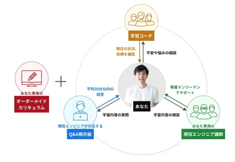全体を通して見えてくるのは、マンツーマン指導とオーダーメイドカリキュラムによって、自分に合った形で学習を進められる環境が整っているという点です。未経験からでも段階的にスキルを身につけられる仕組みがあり、転職や副業といった次のステップまで見据えたサポートがあることも特徴といえます。