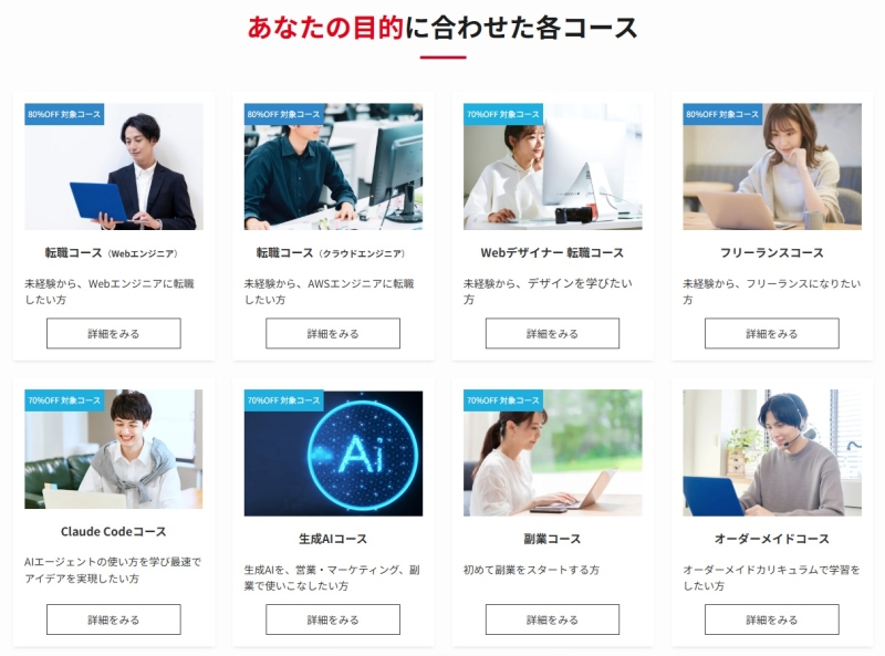 転職・副業・フリーランスなど、目標に合わせて内容を調整できる柔軟さが好評です。 - 未経験からでも段階的にスキルを習得できる