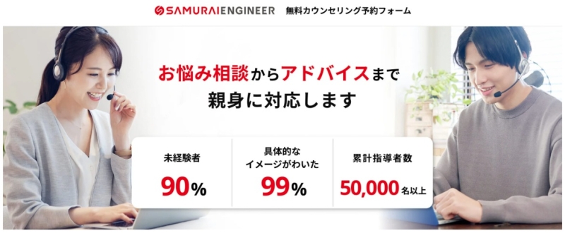 侍エンジニアは、未経験からプログラミングやWebデザインのスキル習得を目指せるオンラインスクールです。マンツーマン指導とオーダーメイドの学習プランを特徴としており、転職や副業、フリーランスなど、それぞれの目的に合わせた学び方ができる点が支持されています。