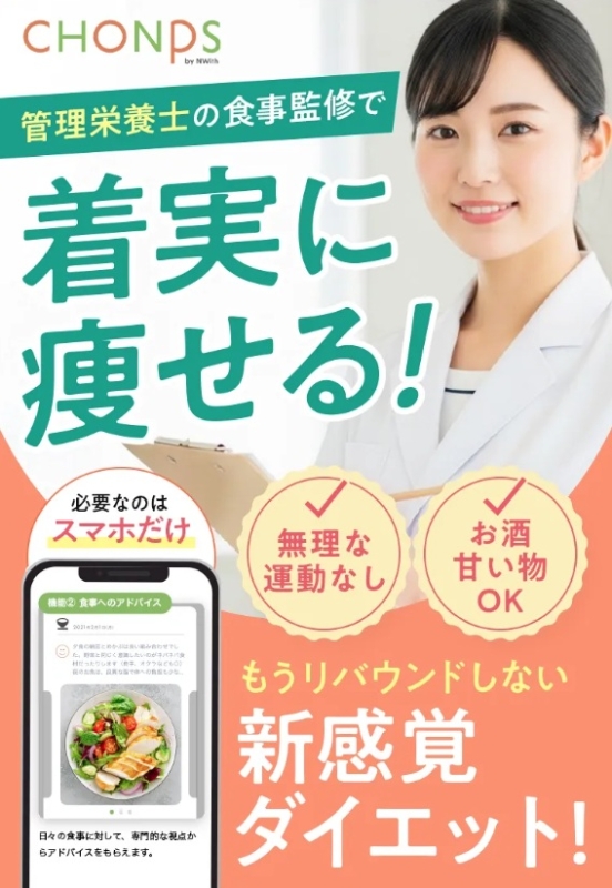 そこで注目されているのが、管理栄養士によるオンライン食事指導サービス「CHONPS(チョンプス)」です。食事制限ではなく“食べ方”にフォーカスし、無理なく体重管理をサポートしてくれるのが特徴とされています。