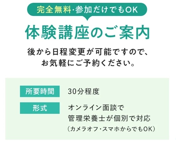 初めての方でも始めやすいように、CHONPSでは無料のオンライン体験が用意されています。カウンセリング形式で現在の食生活を確認しながら、改善の方向性を提案してもらえます。