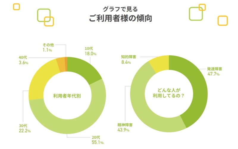 利用者の内訳を見ると、発達障がい・精神障がいの割合が高く、それぞれの特性に配慮した支援が行われていることがうかがえます。