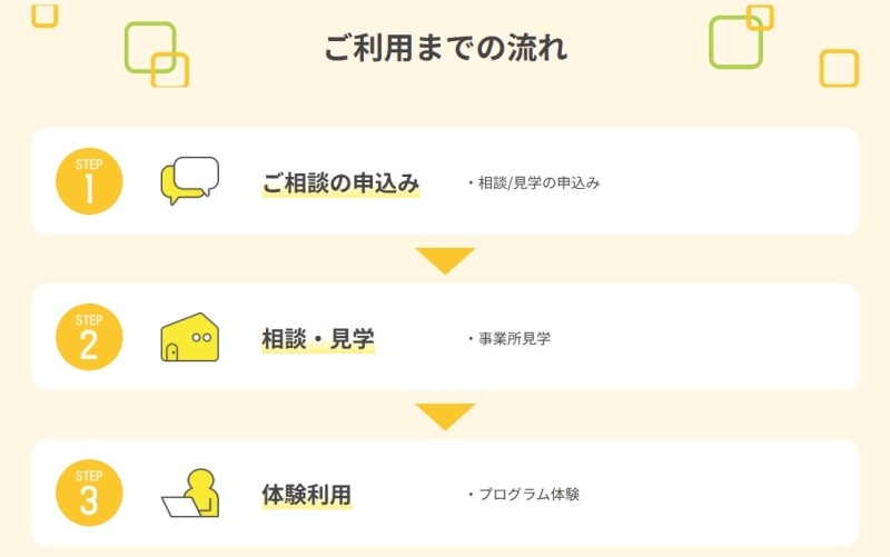 まずは無料相談や資料請求をきっかけに、事業所の雰囲気や支援の進め方を知り、納得してから次に進む流れが一般的です。